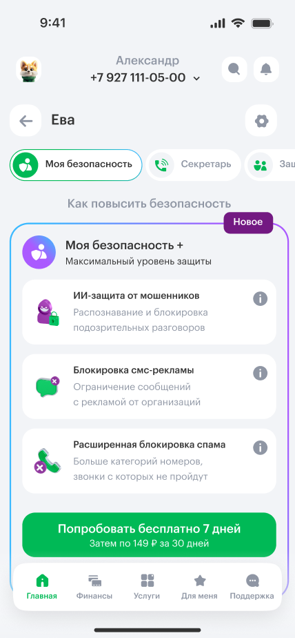 Также можно подключить 2 платные услуги, в которые входят все функции, это «Моя безопасность +» и «Секретарь +». Каждая из этих услуг доступна бесплатно первые 7 дней, затем стоит по 149 ₽ за 30 дней. На некоторых тарифах эта стоимость может списываться по 5 ₽ в сутки.